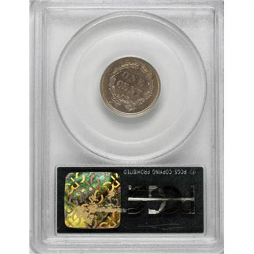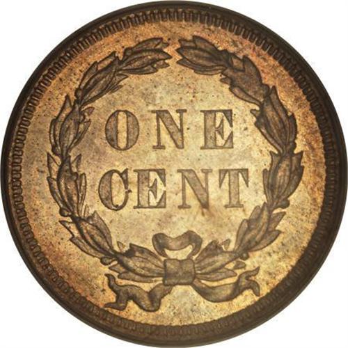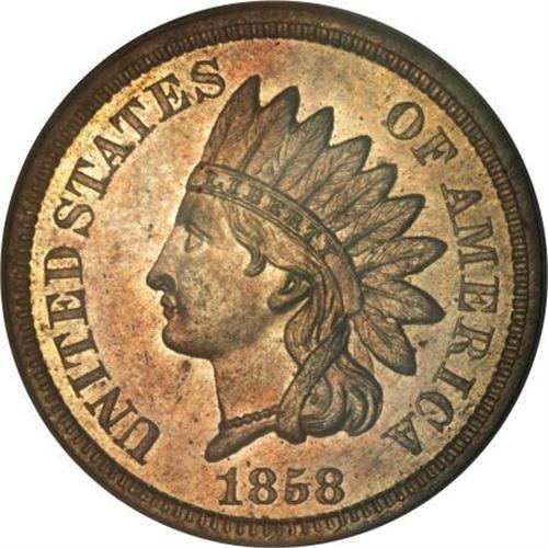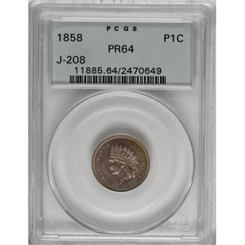 <B>1858 P1C Indian Cent, Judd-208, Pollock-259, Snow-PT28, R.1, PR64 PCGS.</B></I> A transitional pattern with dies similar to the issued 1859 Indian cent. Struck in copper-nickel with a plain edge. Pastel orange, gold, and brick-red compete for territory. Well struck and unabraded with minor carbon. In a green label holder. Although this pattern is considered common, the certified population suggests otherwise. Population: 30 in 64, 16 finer (11/07).<BR><BR><b>Shipping:</b> Coins & Currency (<a target="_blank" href="http://www.heritageauctions.com/common/shipping.php">view shipping information</a>)