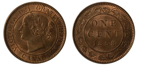 1858. PCGS graded Mint State-65. Red-Brown. 60% evenly distributed red luster over superb fields. Excellent ‘eye appeal’ and tied with one other example for the finest graded by PCGS.