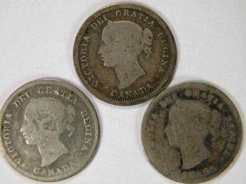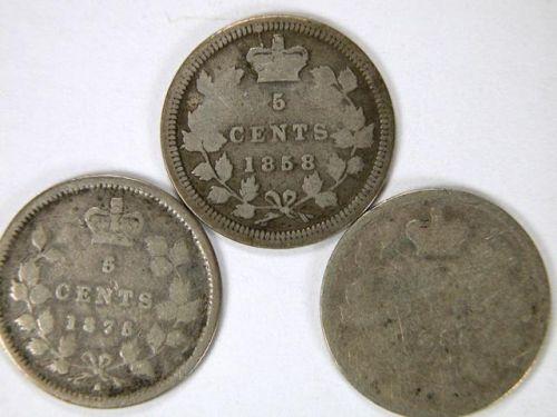 Canada Five Cents 1858 Large Date, 1875H Small Date and 1885 Small 5, all Good or better and lightly toned