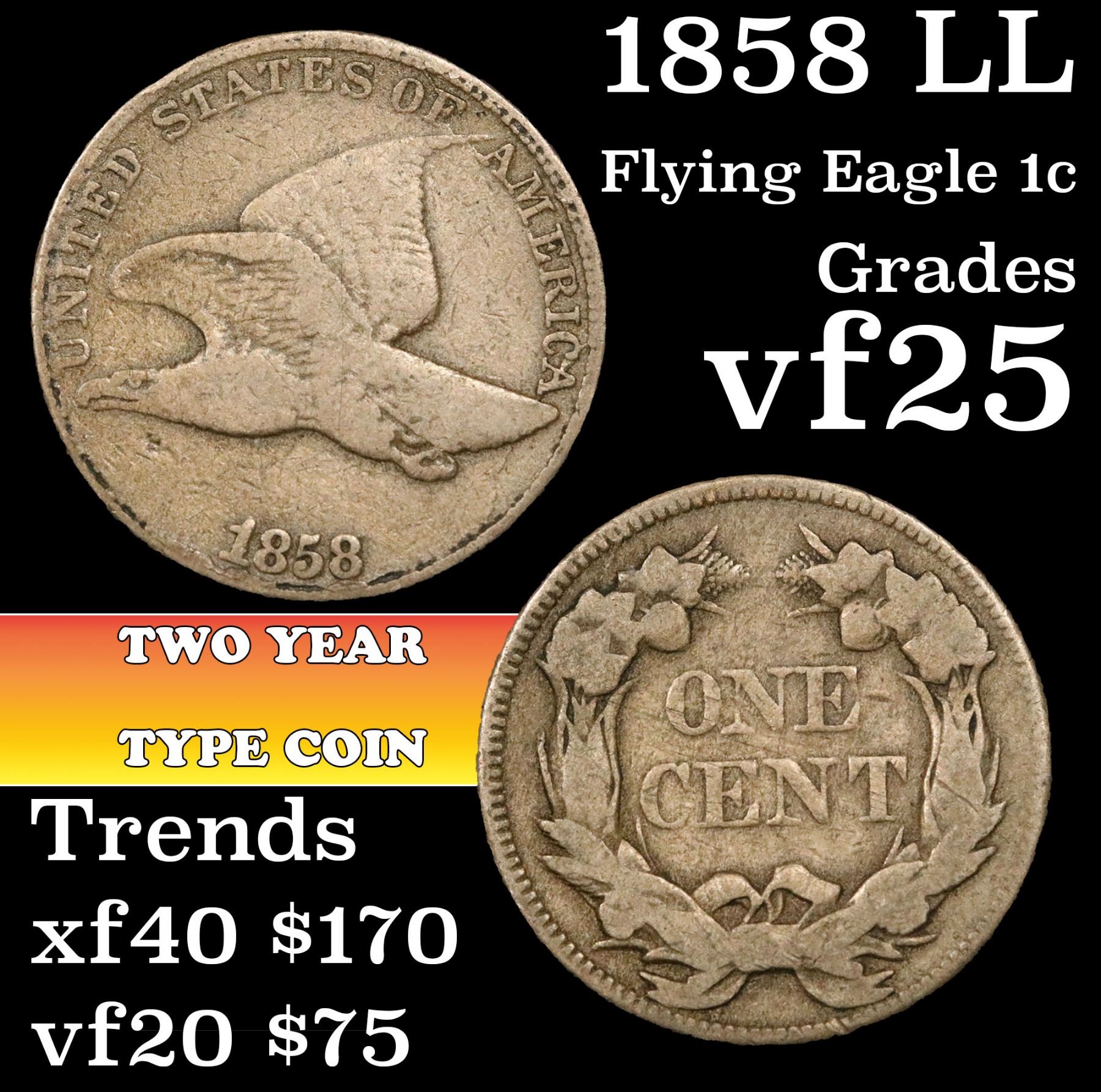1858 LL Flying Eagle Cent 1c Grades vf+.