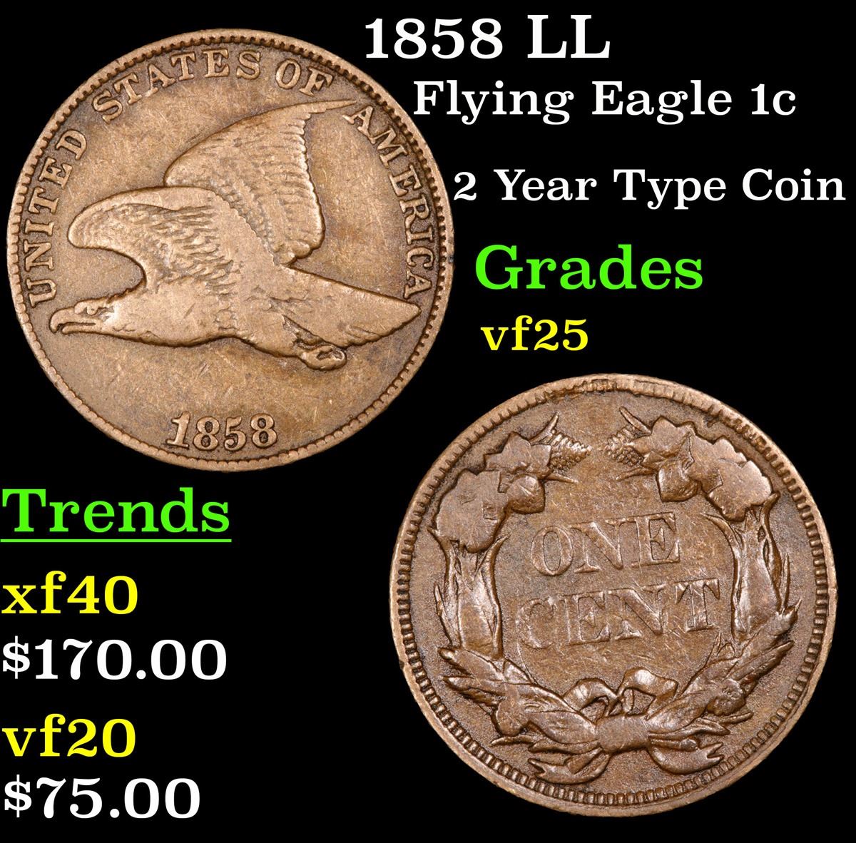 1858 LL 2 Year Type Coin . Flying Eagle Cent 1c Grades vf+.