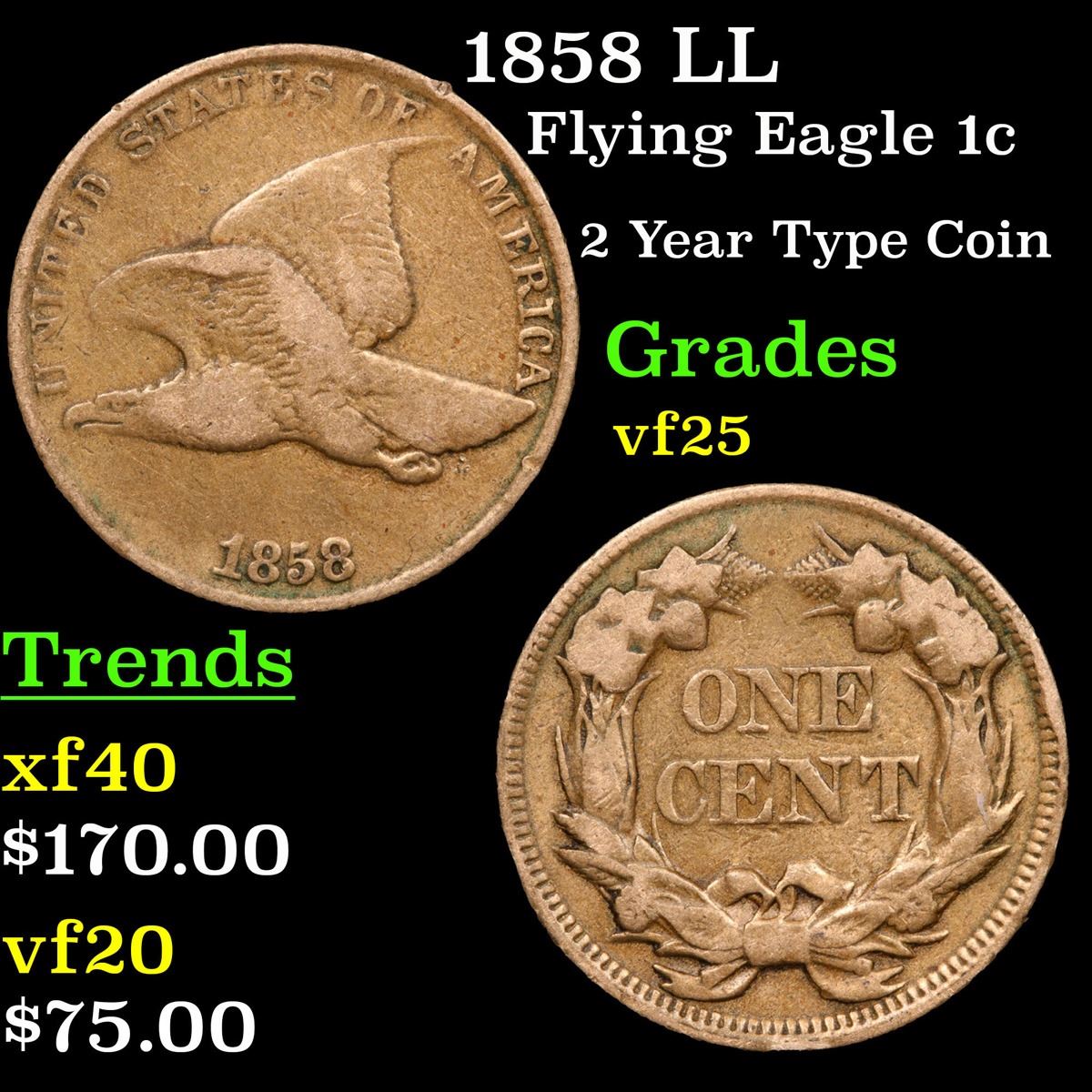 1858 LL Flying Eagle Cent 1c Grades vf+.