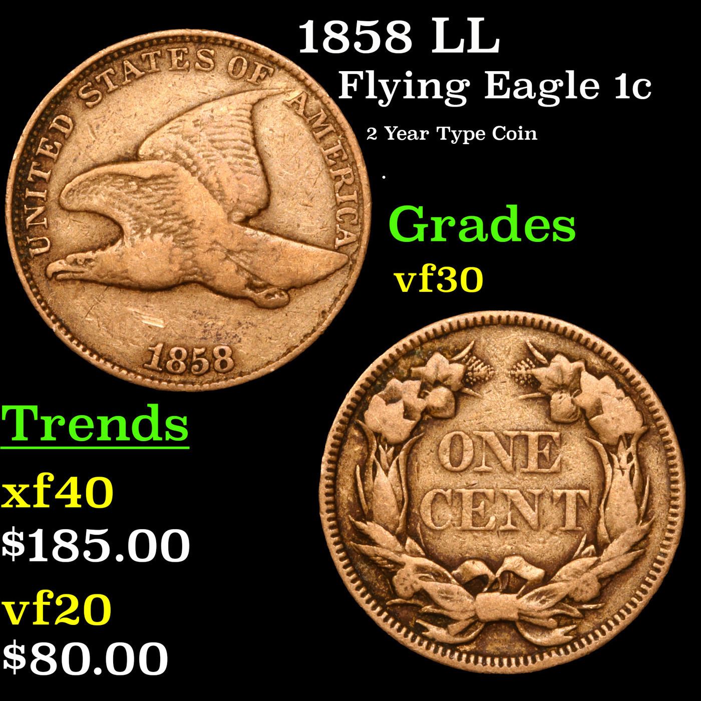 1858 LL Flying Eagle Cent 1c Grades vf++.