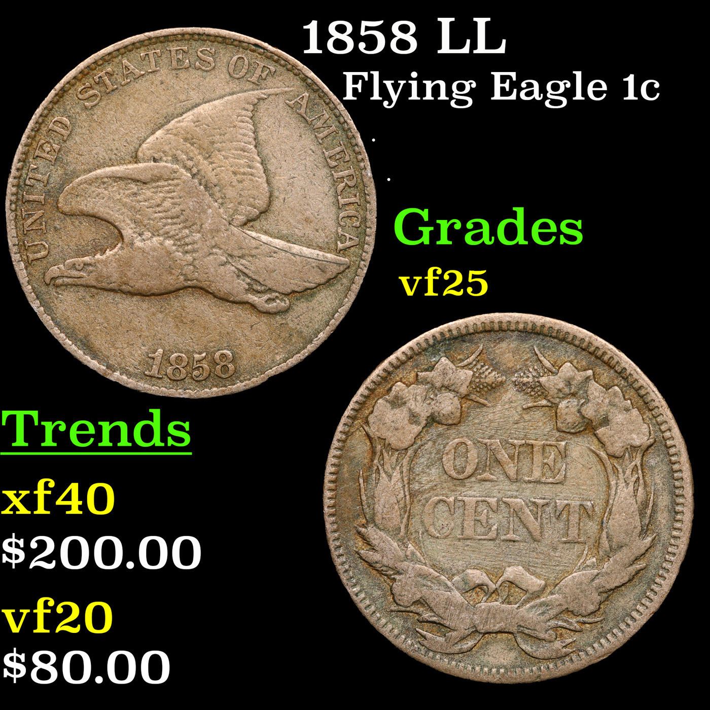 1858 LL Flying Eagle Cent 1c Grades vf+.