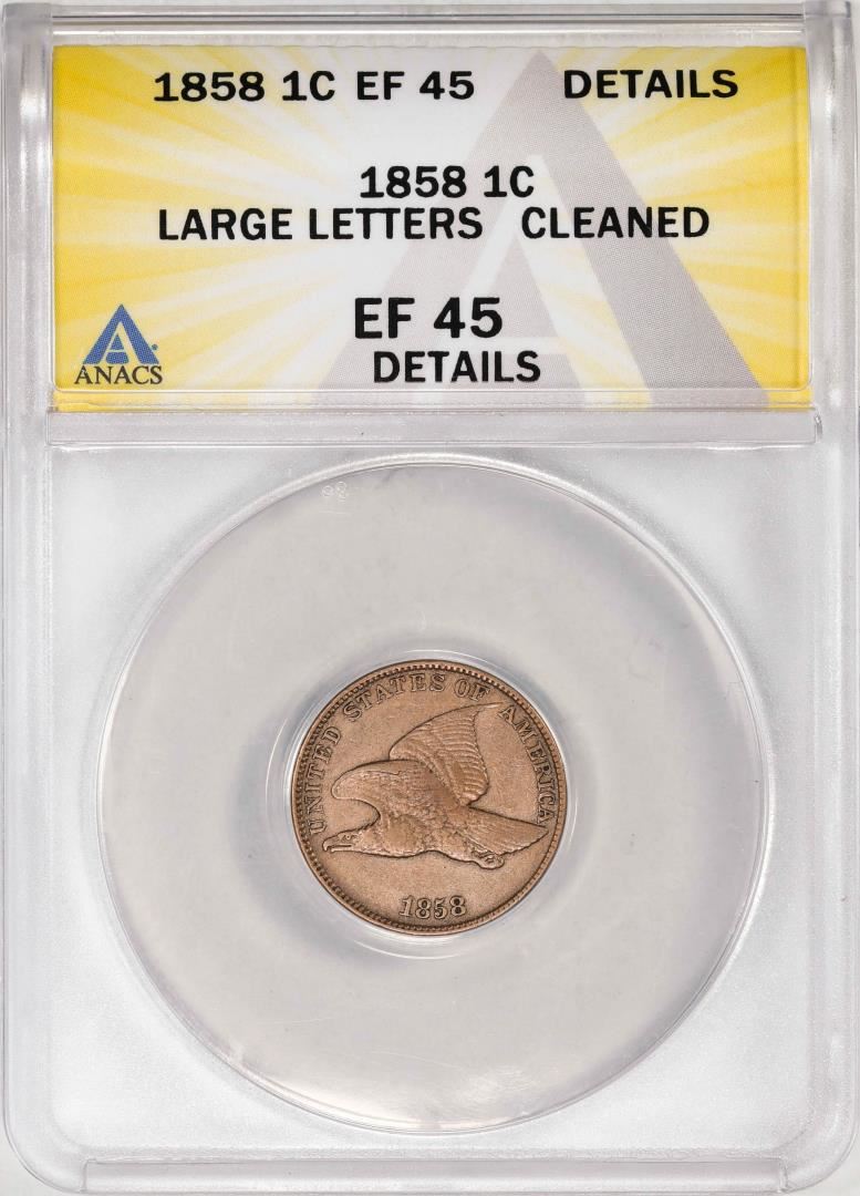 One 1858 Large Letters Flying Eagle Cent Coin ANACS EF45 Details. ANACS Certified.