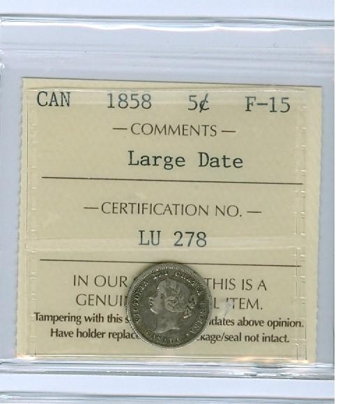 1858 Large date 5¢ ICCS F15, a nice problem free example.