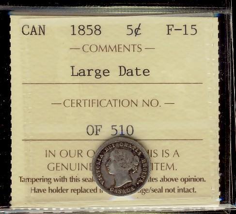 1858 Large date 5¢ ICCS F15, a nice problem free example.