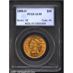 1858-O $10 AU55 PCGS.<p>An uncommonly high grade representative of this, the most common No Motto Eagle from the New Orleans Mint, both sides are sharply struck over the focal features. Remnants of softly frosted luster are evident at most angles, as are curious lavender tinged streaks in the obverse field around Liberty's portrait. Typically abraded for a circulated gold coin of this size. Important notice: We expect to be auctioning lots at the rate of 200-250 per hour. Sometimes eBay Premier live bid software cannot keep up with that pace, so we strongly recommend that you place a realistic proxy bid now as insurance to avoid disappointment. Also please note that all Heritage/CAA lots purchased through eBay Premier carry a 20% Buyer's Premium.