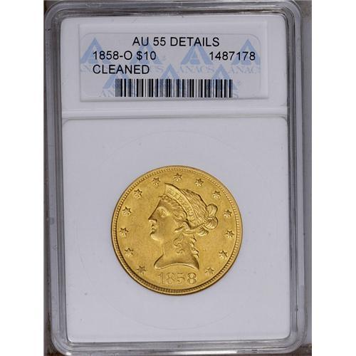 <B>1858-O<$10>--Cleaned--ANACS. AU55 Details.</B></I> Patches of hairlines emerge upon thorough evaluation, but this slightly glossy better date O-mint eagle is seldom seen with such little wear. Only 20,000 pieces were struck.