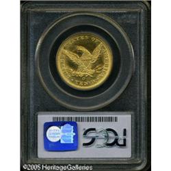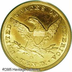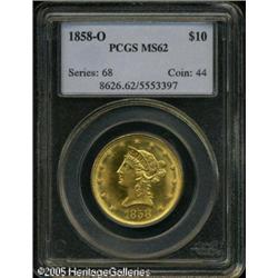 <B>1858-O $10 MS62 PCGS.</B></I> It has been ten years (October, 1995) since we offered an 1858-O ten that was comparable in grade to this piece. While once regarded as rare in any condition, the discovery of a small hoard of 15-30 pieces in Jackson, Tennessee in 1985 changed the landscape of the Condition Census for this issue. Some of these hoard pieces were even Mint State, but were considered only average quality Uncs. This is a wonderful piece that has strong semi-prooflike fields on each side that have a bit of scattered cartwheel luster intermixed. The central details are sharply impressed with the only area of weakness being on the peripheral stars. The bright yellow-gold surfaces have a slight overlay of reddish patina, and the only mark of note is a long, diagonal dig in the reverse field just left of the eagle's beak. Population: 3 in 62, 1 finer (1/05). Lot:8756
