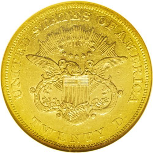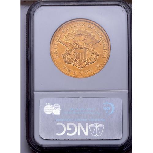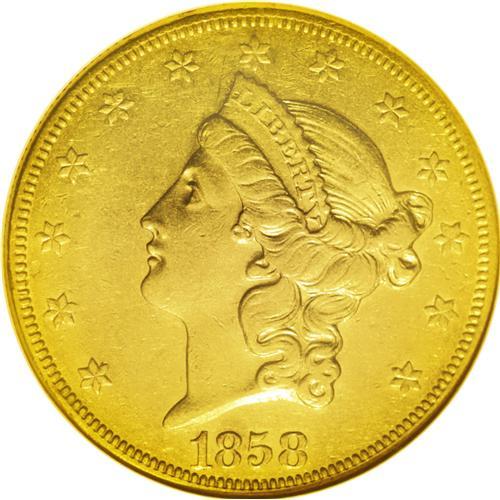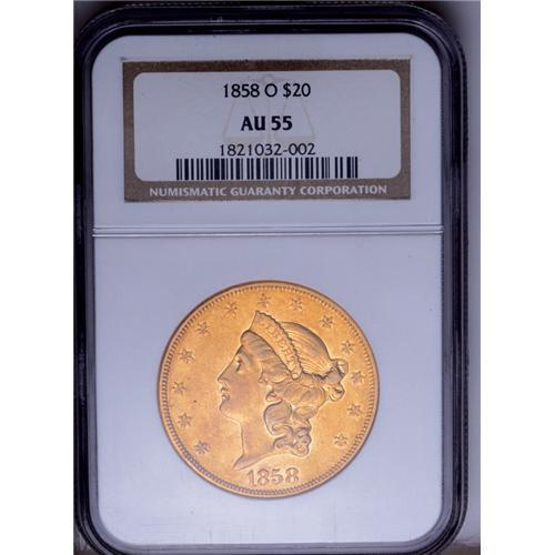 <B>1858-O<$20> AU55 NGC.</B></I> This example has the appearance of a blundered obverse die, but it is not the variety described by Breen with an extra 8 protruding from the lowest hair curl. Instead, a projection extends from a hair strand into the middle of the neck, and it has every appearance of being a bottom serif from a stray digit 1. Another stray projection extends into the field from the upper left curve of the first 8 in the date. Each individual collector will have to determine if this variety is worthy of a premium over the normal market value for this date.<BR> The mintage of this issue was 35,250 coins, and it is similar in overall rarity to the 1857-O double eagle. Examples are readily available in VF and XF grades, but seldom seen any nicer. Only eight examples were located among bounty from the <I>S.S. Republic,</B></I> compared to 64 examples of the 1858-S double eagle. Both sides are highly lustrous with rich orange-gold color. The surfaces are mildly abraded with evidence of a mild obverse rim bruise at star 1. This example has a weak, but clearly visible mintmark. Some prooflike surface is still visible in the protected areas around the devices.<BR><I>From The Wyoming Collection.</B></I>
