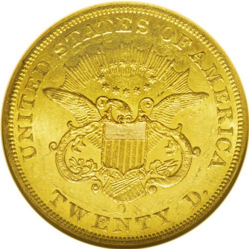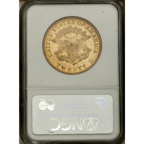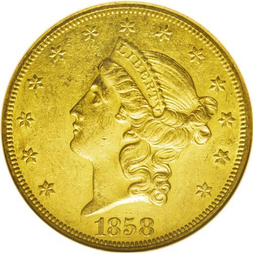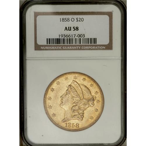 <B>1858-O<$20> AU58 NGC.</B></I> This coin represents above-average quality for the issue. Most of the certified About Uncirculated 1858-Os are in the AU50 to AU55 range. This issue is very scarce in properly graded AU58, and extremely rare in Mint State, where a mere four coins have been certified by the two major services.<BR> This is a particularly pleasing piece that is better struck than most known examples. The first four stars are well defined, as is the rest of the coin. There are no severe abrasions on either side, and the coin has attractive, bright green-gold coloration with red-orange peripheral accents. The near-absence of highpoint wear also makes this piece seem like a conservatively graded, high-end example. Census: 22 in 58, 3 finer (7/06).