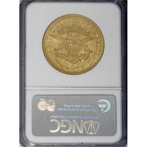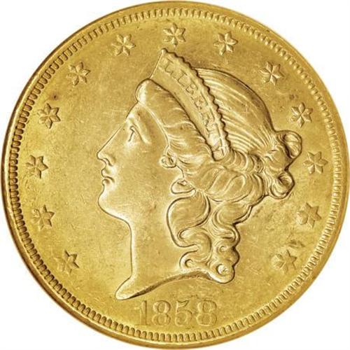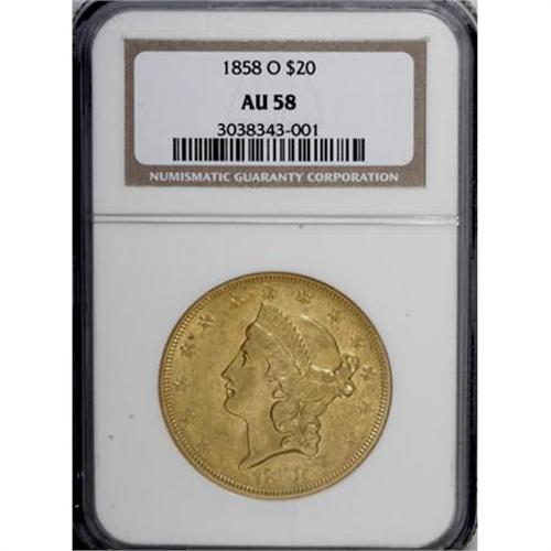 <B>1858-O $20 AU58 NGC.</B></I> The 1858-O double eagle, with a mintage of 35,250 coins, is considered to be of similar rarity to the 1857-O, that shows a mintage of 30,000 pieces. It is usually seen in Very Fine or Extremely Fine condition. Low-end AU examples are scarce, while AU55 and AU58 pieces are rare. Mint State specimens are nearly unobtainable; indeed, NGC and PCGS have seen only four 1858-O Uncirculated twenties, with MS62 being the highest.<BR> Rich peach-gold color adorns this AU58 example, and a solid strike manifests itself in excellent detail on the design features. While this issue is almost always very heavily abraded (Douglas Winter, <I>Gold Coins of the New Orleans Mint</B></I> (2006), this particular example reveals just the normal scattering of marks expected to be present on a large, heavy gold coin that has seen some circulation. The surfaces retain a good amount of luster on both sides.<BR><BR><B>Coin Engraver:</B> James B. Longacre<BR><BR><b>Shipping:</b> Coins & Currency (<a target="_blank" href="http://www.heritageauctions.com/common/shipping.php">view shipping information</a>\)