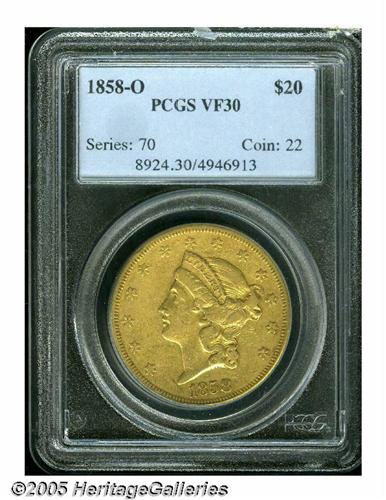 1858-O $20 VF30 PCGS. This is a rare issue, with