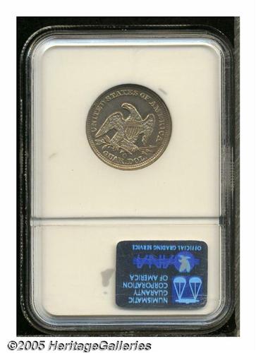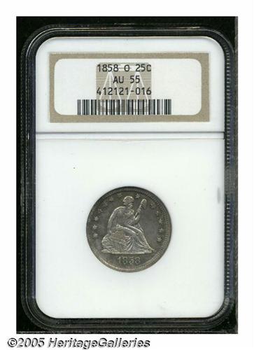 <B>1858-O<25C> AU55 NGC.</B></I> Cobalt-blue and pale lavender patina rests over each side. The design elements show relatively good detail, particularly for a New Orleans Mint product. A few minor contact marks are seen along Liberty's right arm. Population: 6 in 55, 11 finer (5/05).
