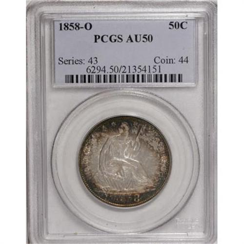 <B>1858-O 50C AU50 PCGS.</B></I> PCGS Population (19/150). NGC Census: (13/171). Mintage: 7,294,000. Numismedia Wsl. Price for NGC/PCGS coin in AU50: $195. (#6294)<BR><BR><B>Coin Engraver:</B> Christian Gobrecht<BR><BR><b>Shipping:</b> Coins & Currency (<a target="_blank" href="http://www.heritageauctions.com/common/shipping.php">view shipping information</a>)