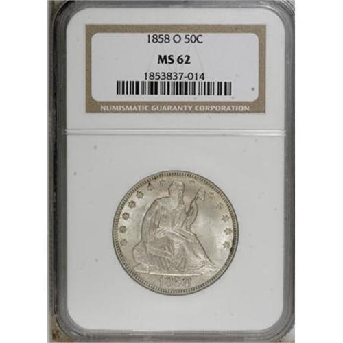 <B>1858-O 50C MS62 NGC.</B></I> NGC Census: (28/43). PCGS Population (32/36). Mintage: 7,294,000. Numismedia Wsl. Price for NGC/PCGS coin in MS62: $550. (#6294)<BR><BR><b>Shipping:</b> Coins & Currency (<a target="_blank" href="http://www.heritageauctions.com/common/shipping.php">view shipping information</a>)