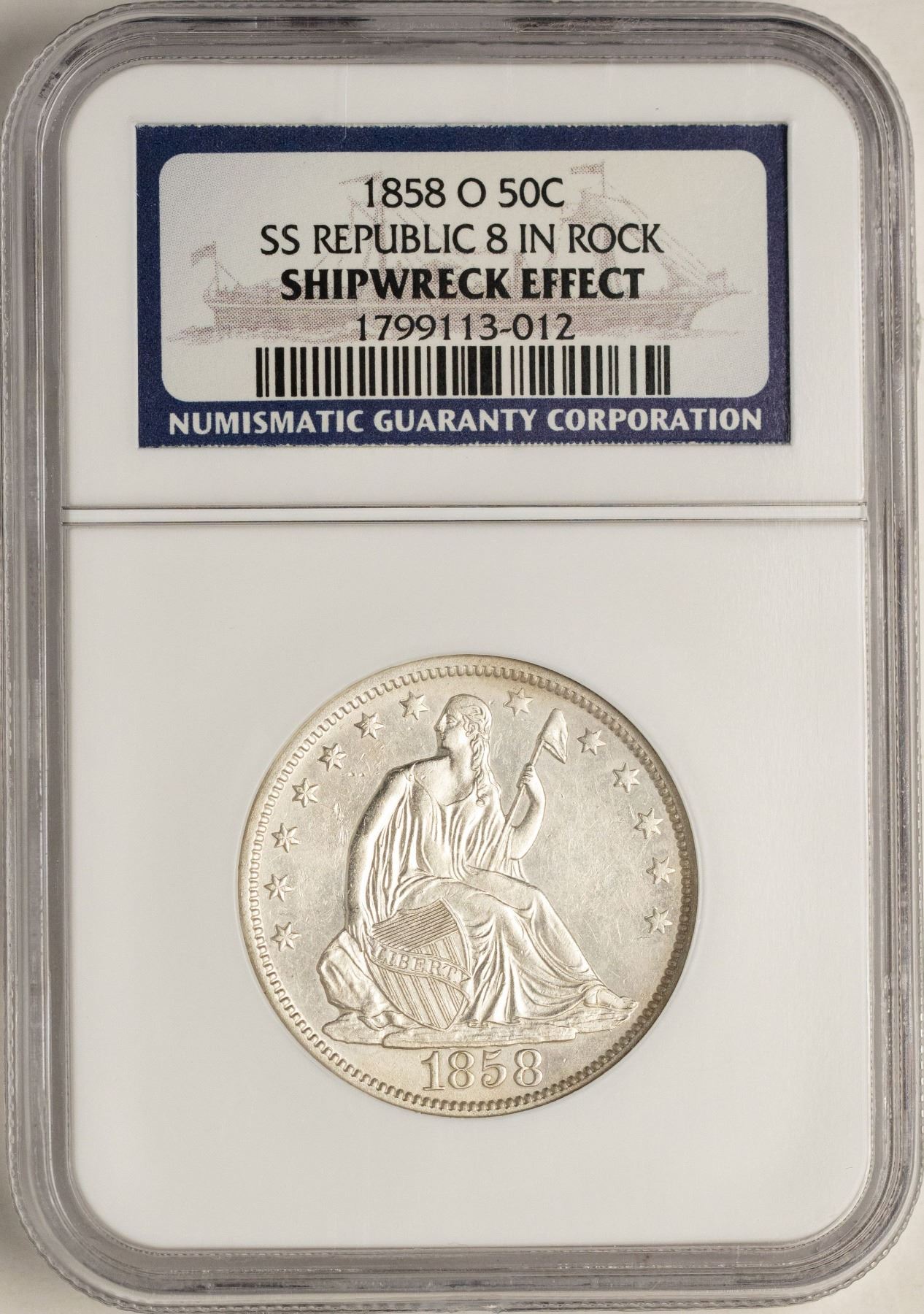 1858-O 8 in Rock Seated Liberty Half Dollar Coin NGC Shipwreck Effect w/ Book