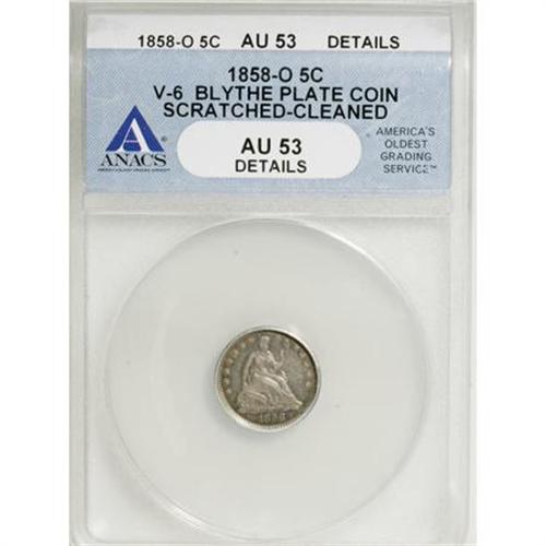 <B>1858-O H10C Blythe Plate--Cleaned, Scratched--ANACS AU53 Details.</B></I> V-6. NGC Census: (1/167). PCGS Population (4/137). Mintage: 1,660,000. Numismedia Wsl. Price for NGC/PCGS coin in AU53: $140. (#4369)<BR><I>From The Al Blythe Collection of Half Dimes.</B></I><BR><BR><B>Coin Engraver:</B> Christian Gobrecht<BR><BR><b>Shipping:</b> Coins & Currency (<a target="_blank" href="http://www.heritageauctions.com/common/shipping.php">view shipping information</a>)