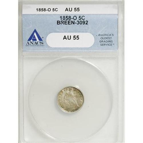 <B>1858-O H10C AU55 ANACS.</B></I> Breen-3092. NGC Census: (2/165). PCGS Population (6/131). Mintage: 1,660,000. Numismedia Wsl. Price for NGC/PCGS coin in AU55: $150. (#4369)<BR><I>From The Al Blythe Collection of Half Dimes.</B></I><BR><BR><B>Coin Engraver:</B> Christian Gobrecht<BR><BR><b>Shipping:</b> Coins & Currency (<a target="_blank" href="http://www.heritageauctions.com/common/shipping.php">view shipping information</a>)