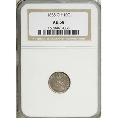 <B>1858-O H10C AU58 NGC.</B></I> . NGC Census: (23/142). PCGS Population (14/117). Mintage: 1,660,000. Numismedia Wsl. Price for NGC/PCGS coin in AU58: $165. (#4369)<BR><BR><B>Coin Engraver:</B> Christian Gobrecht<BR><BR><b>Shipping:</b> Coins & Currency (<a target="_blank" href="http://www.heritageauctions.com/common/shipping.php">view shipping information</a>)