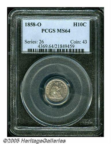 <B>1858-O<H10C> MS64 PCGS.</B></I> Satiny with faint die clashing beneath splashes of violet and steel-blue toning. A more obtainable Stars Obverse issue in Mint State, with the added bonus of being an O-mint. Population: 34 in 64, 11 finer (3/05).