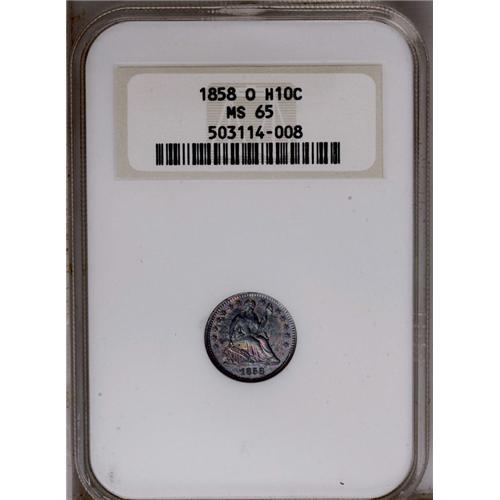 <B>1858-O<H10C> MS65 NGC.</B></I> Forest-green and plum-red toning alternate across this unabraded Gem. Struck from strongly clashed dies, and housed in a prior generation holder. Census: 13 in 65, 4 finer (5/06).
