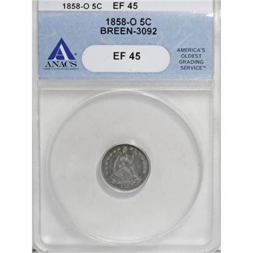 <B>1858-O H10C XF45 ANACS.</B></I> Breen-3092. NGC Census: (1/170). PCGS Population (4/144). Mintage: 1,660,000. Numismedia Wsl. Price for NGC/PCGS coin in XF45: $78. (#4369)<BR><I>From The Al Blythe Collection of Half Dimes.</B></I><BR><BR><B>Coin Engraver:</B> Christian Gobrecht<BR><BR><b>Shipping:</b> Coins & Currency (<a target="_blank" href="http://www.heritageauctions.com/common/shipping.php">view shipping information</a>)