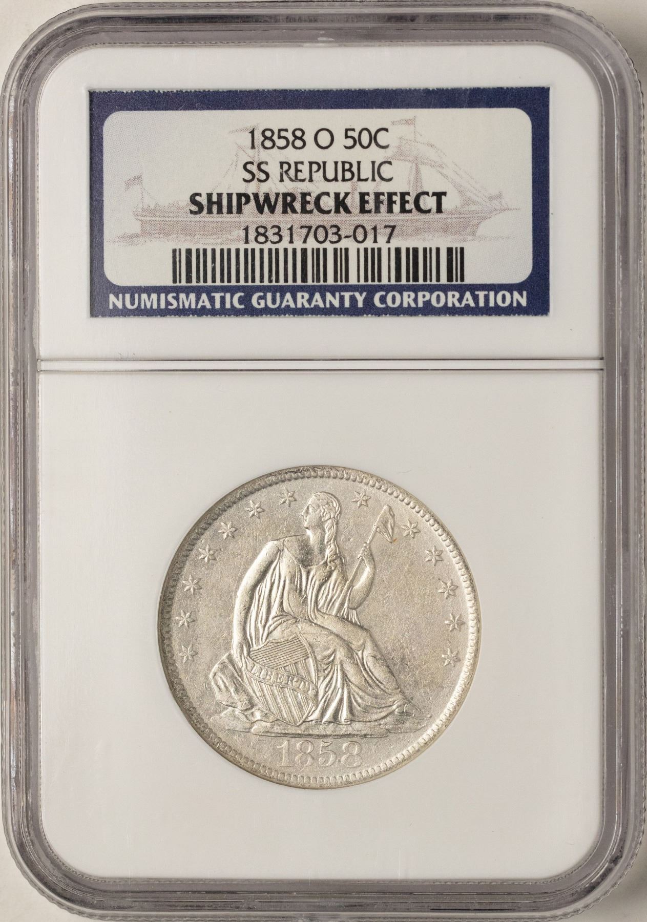 One 1858-O SS Republic Seated Liberty Half Dollar Coin NGC Shipwreck Effect with Book.