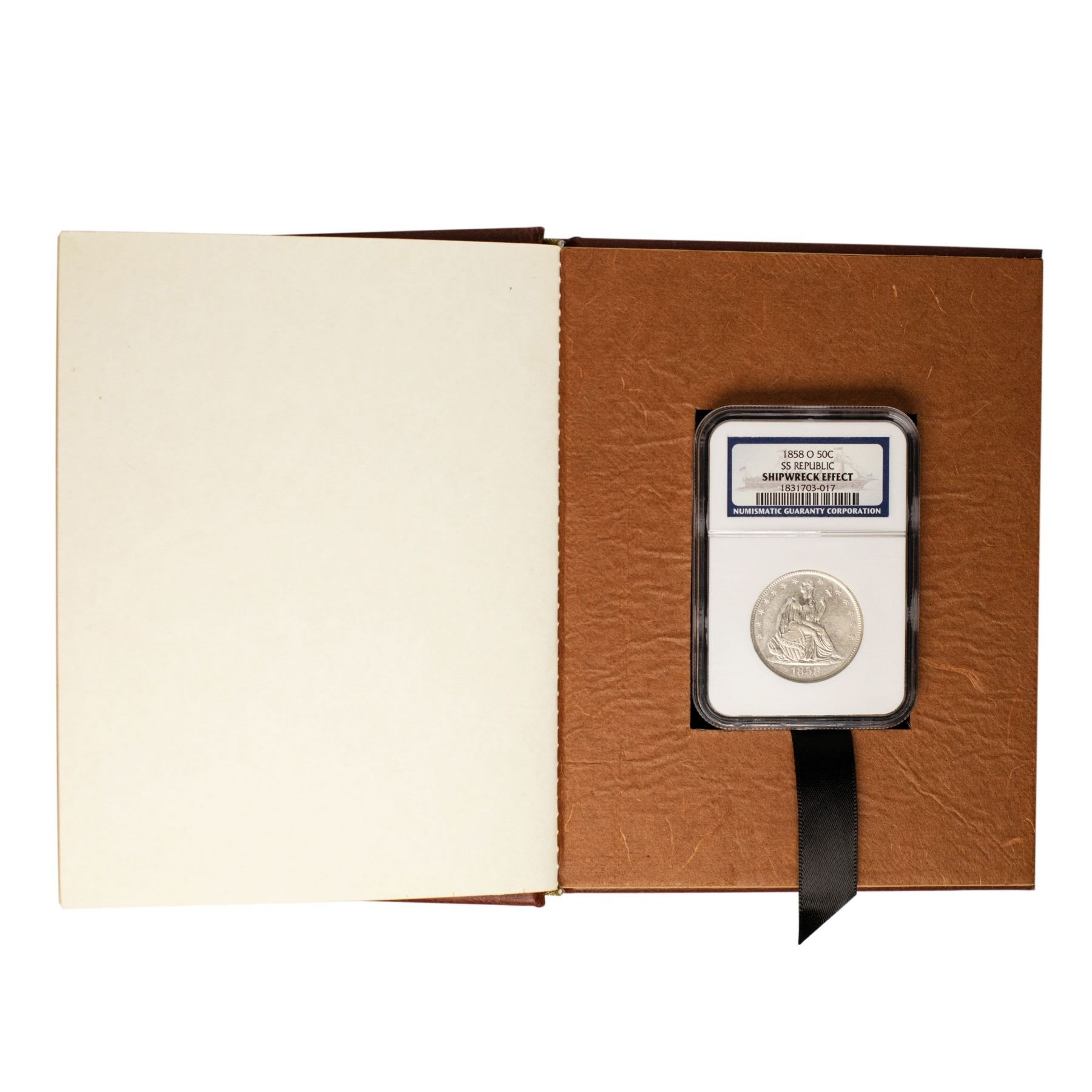 1858-O SS Republic Seated Liberty Half Dollar Coin NGC Shipwreck Effect with Book