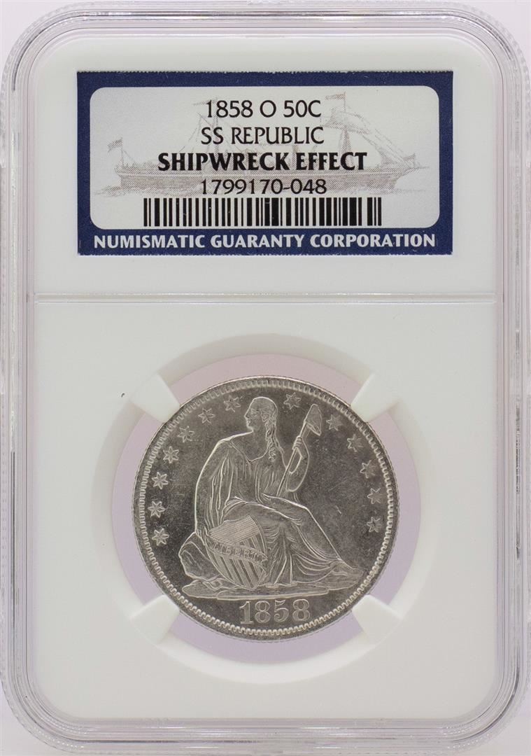 One 1858-O SS Republic Seated Liberty Half Dollar Coin NGC Shipwreck Effect with Book. NGC Certified.
