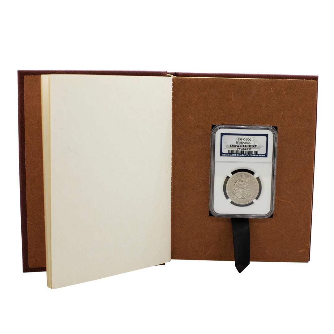 1858-O SS Republic Seated Liberty Half Dollar Coin NGC Shipwreck Effect with Book