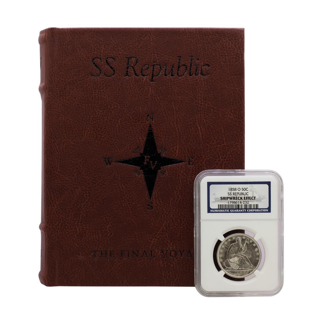 1858-O SS Republic Seated Liberty Half Dollar Coin NGC Shipwreck Effect with Book