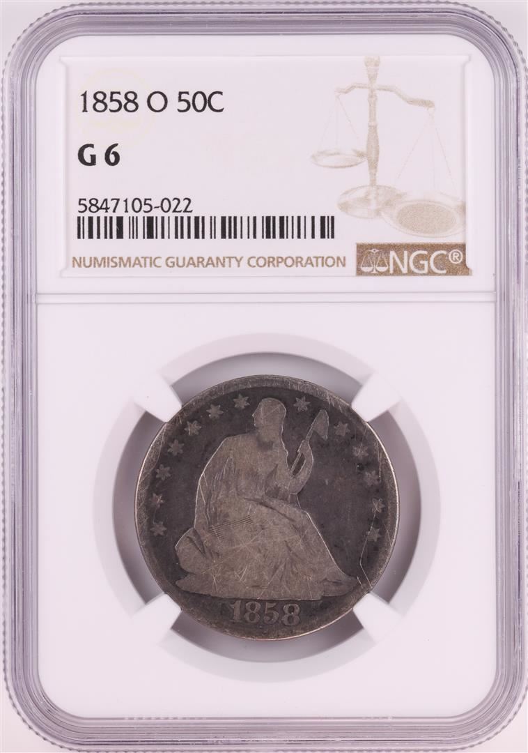 One 1858-O Seated Liberty Half Dollar Coin NGC G6. NGC Certified.