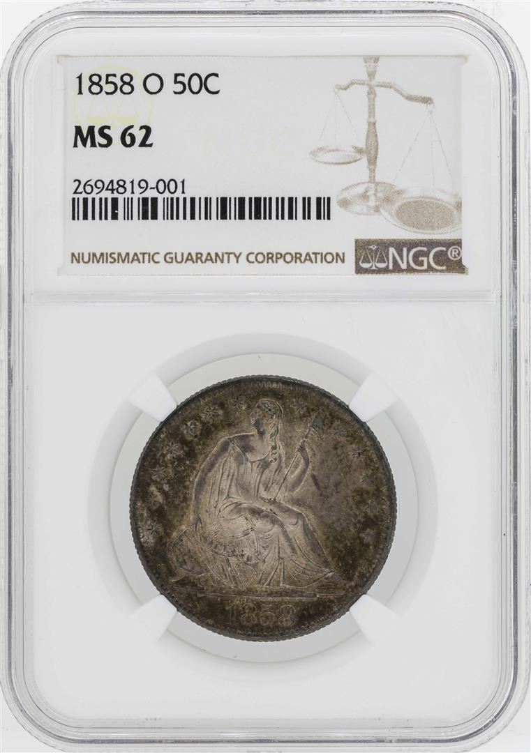 One 1858-O Seated Liberty Half Dollar Coin NGC MS62. NGC Certified.