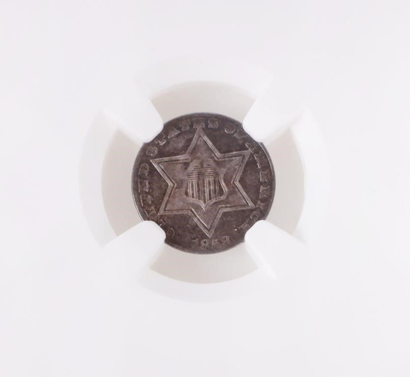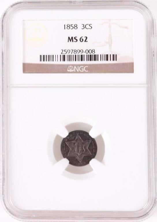 1858 P Silver 3 cent piece NGC graded MS-62 to include protective casing, a certification barcode, and a box to hold the coin.