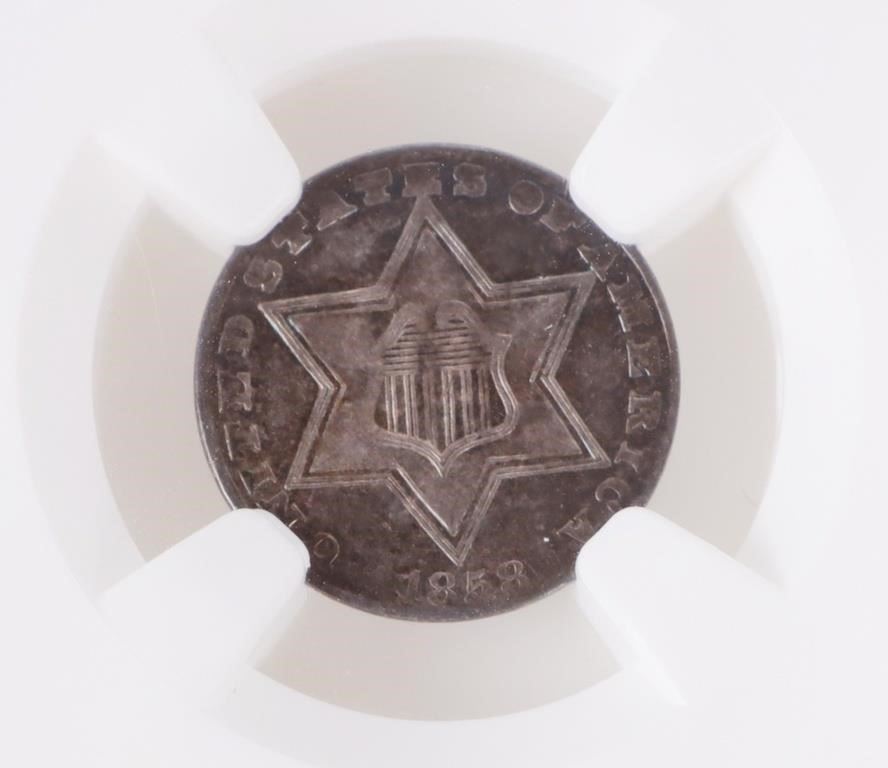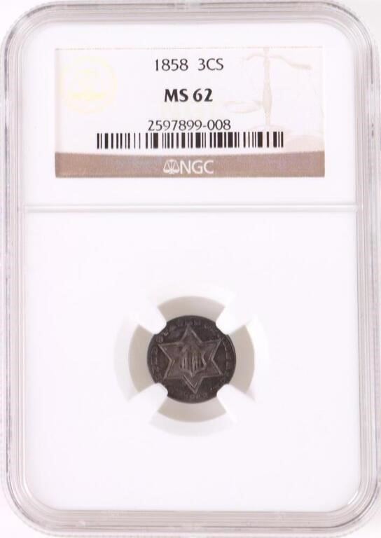 1858 P Silver 3 cent piece NGC graded MS-62 to include protective casing, a certification bar code, and a box to hold the coin.