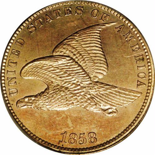 <B>1858<P1C> Flying Eagle Cent, Judd-191, Pollock-233-234, R.5, PR63 PCGS.</B></I> A transitional pattern that combines the regular dies, Small Letters obverse from 1858 with the laurel wreath reverse of 1859. Struck in copper-nickel with a plain edge. An attractive Select specimen, the orange-tan surfaces are pleasingly bright in the fields with needle sharp striking definition over the devices. Were it not for a couple of carbon flecks on the reverse and some scattered hairlines, this mostly blemish-free specimen would probably have secured a finer rating.