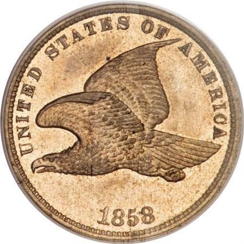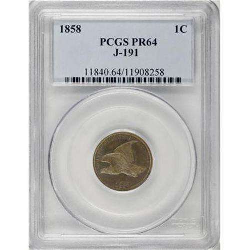 <B>1858 P1C Flying Eagle Cent, Judd-191, Pollock-233, R.5, PR64 PCGS.</B></I> Snow-PT14 with five leaf clusters in the wreath. The obverse is from a regular Flying Eagle Small Letters die, while the reverse displays the wreath introduced on the 1859 Indian cent. Struck in copper-nickel with a plain edge. Well struck and satiny with dusky golden toning. Population: 18 in 64, 5 finer (2/08).<BR><BR><b>Shipping:</b> Coins & Currency (<a target="_blank" href="http://www.heritageauctions.com/common/shipping.php">view shipping information</a>)
