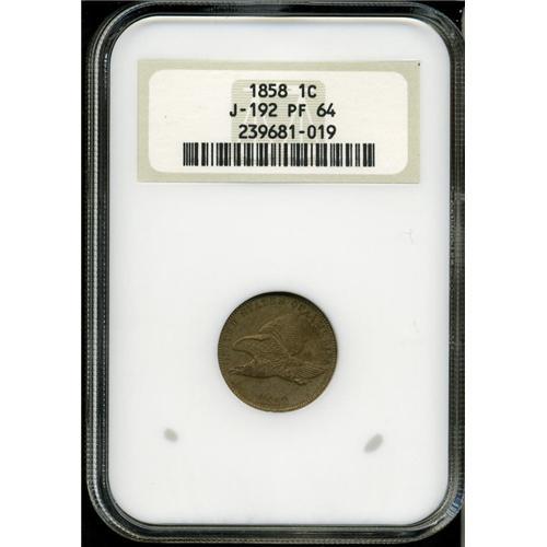 <B>1858 P1C Flying Eagle Cent, Judd-192, Pollock-235, R.5, PR64 NGC.</B></I> The obverse is the familiar Small Letters 1858 cent. The pattern reverse generally resembles the 1860 regular issue reverse, but there is no shield at the top and the wreath is closed. On this piece, the obverse lettering is small. This is the more commonly encountered of the two variants. Struck in copper-nickel with a plain edge. The surfaces are lustrous gray-tan with iridescent undertones.<BR><BR><b>Shipping:</b> Coin/Currency (<a target="_blank" href="http://www.heritageauctions.com/common/shipping.php">view shipping information</a>)