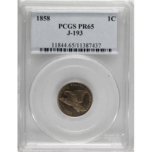 <B>1858 P1C Flying Eagle Cent, Judd-193, Pollock-236, R.5, PR65 PCGS.</B></I> Snow-PT11. The obverse is identical to the regular issue 1858 Small Letters cent. The reverse, while similar to that adopted for the Indian cent in 1860, displays a broad, ornamented shield at the top. Struck in copper-nickel with a plain edge. While a relatively common pattern, this design is popular with collectors and is relatively high-priced for an R.5. This is an exceptionally attractive example that shows strong reflectivity in the fields. Each side is overlaid in appealing shades of lilac-gray and deep rose.<BR><BR><b>Shipping:</b> Coins & Currency (<a target="_blank" href="http://www.heritageauctions.com/common/shipping.php">view shipping information</a>)