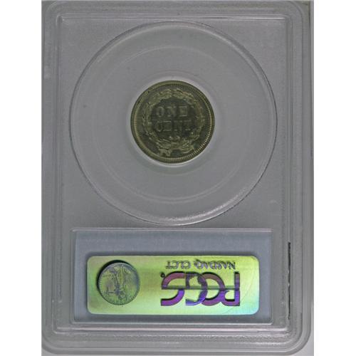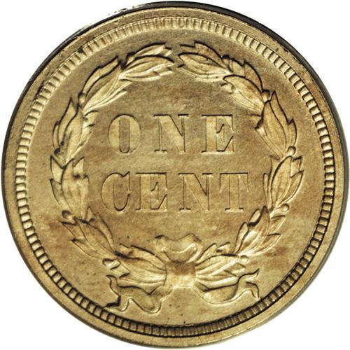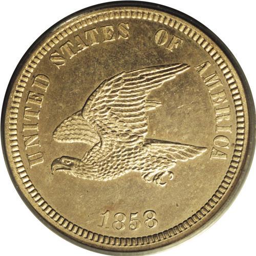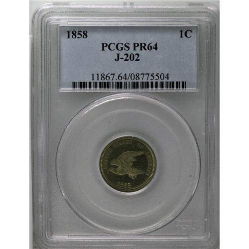 <B>1858<P1C> Flying Eagle Cent, Judd-202, Pollock-245, R.5, PR64 PCGS.</B></I> Snow-PT19. The small eagle obverse with open claws and raised wings. The tall, thin obverse letters represent Paquet's style. The reverse is similar to the regular issue 1859 Indian cent. Struck in copper nickel with a plain edge. This nicely mirrored light golden-brown near-Gem is intricately struck and has a few pinpoint carbon flecks.