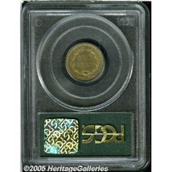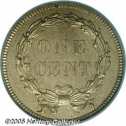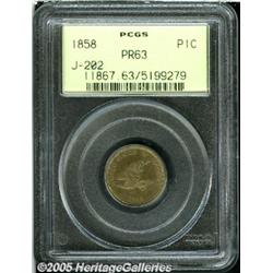 <B>1858 P1C Flying Eagle Cent, Judd-202, Pollock-245-246, R.5, PR63 PCGS.</B></I> The obverse shows a small eagle flying left with the date below and the legend UNITED STATES OF AMERICA above. The reverse displays the denomination ONE CENT within an oak wreath that has clusters of five leaves. Struck in copper-nickel with a plain edge. Popularly called the "Skinny Eagle," this survivor exhibits partially reflective fields beneath mottled, olive-tan patina. There are no individually distracting surface disruptions.