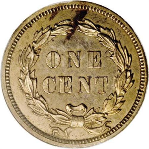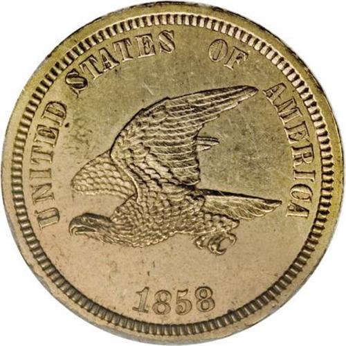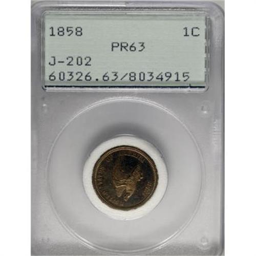 <B>1858 P1C Flying Eagle Cent, Judd-202, Pollock-246, R.7, PR63 PCGS.</B></I> Snow-PT20. The small eagle obverse with open claws and raised wings. The tall, thin obverse letters probably represent Paquet's style. The reverse is similar to the regular issue 1859 Indian cent. Snow states, "A very rare pattern, probably no more than 10 struck in all. These were probably struck after the 6 leaf laurel wreath reverse was adopted in 1859." In other words, PT20 is likely a restrike from muled dies. The variety with six leaf clusters within the laurel wreath is much scarcer than the Pollock-245, Snow-PT19 five leaf clusters variety. Struck in copper-nickel with a plain edge. The fields are brightly reflective with a significant overlay of reddish patina on each side. Lightly spotted.<BR><BR><b>Shipping:</b> Coins & Currency (<a target="_blank" href="http://www.heritageauctions.com/common/shipping.php">view shipping information</a>)
