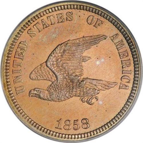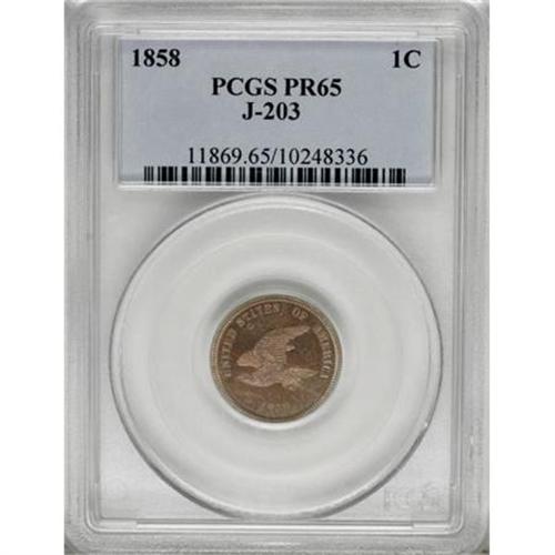 <B>1858 P1C Flying Eagle Cent, Judd-203, Pollock-247, R.5, PR65 PCGS.</B></I> Snow-PT18, Die pair 1-A. Assistant engraver Anthony C. Paquet is credited with the obverse flying eagle device, which is smaller in scale and differently styled than Longacre's issued version. Thin, tall letters in UNITED STATES OF AMERICA fit Paquet's style, seen on the Type Three three cent silver and the famous 1861-S double eagle. The reverse features a broad oak wreath without a shield. Struck in copper-nickel with a plain edge. Struck from moderately rotated dies. Pastel-red and gold hues adorn smooth surfaces. Minor carbon is present, and the reverse rim has small nicks at 9 and 10 o'clock.<BR><I>From The Madison Collection.</B></I><BR><BR><b>Shipping:</b> Coins & Currency (<a target="_blank" href="http://www.heritageauctions.com/common/shipping.php">view shipping information</a>)
