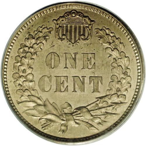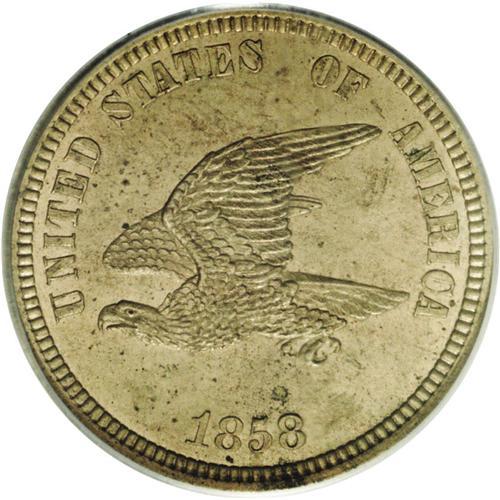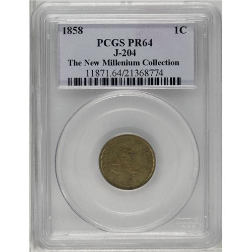 <B>1858<P1C> Flying Eagle Cent, Judd-204, Pollock-248, R.5, PR64 PCGS.</B></I> Ex: New Millennium Collection. Flying Eagle pattern with a hook-necked eagle in flight on the obverse. The reverse has an oak wreath with a broad, ornamented shield at the top. Struck in copper-nickel with a plain edge. A few minor spots are noticed on the obverse of this needle-sharp, but somewhat subdued example.