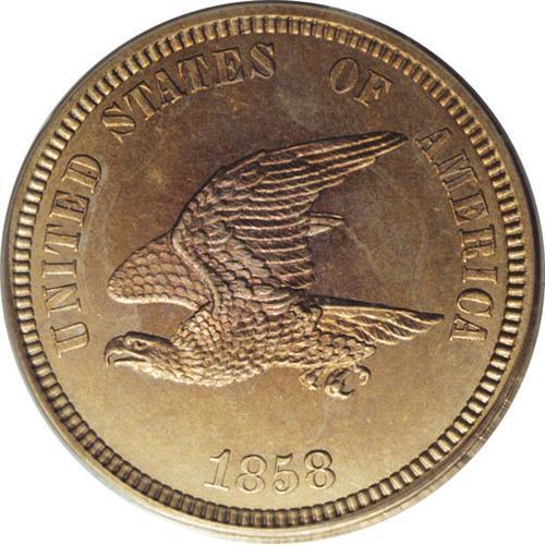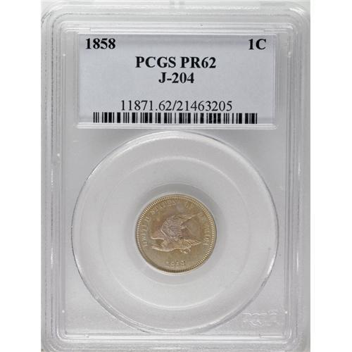 <B>1858 P1C Flying Eagle Cent, Judd-204, Pollock-248, R.5, PR62 PCGS.</B></I> Paquet's small flying eagle motif is paired with an ornamental shield and oak wreath reverse. Struck in copper-nickel with a plain edge. This is a sharply struck light tan proof with excellent eye appeal. Faint hairlines are the only grade limiting factor.<BR><BR><b>Shipping:</b> Coin/Currency (<a target="_blank" href="http://www.heritageauctions.com/common/shipping.php">view shipping information</a>)
