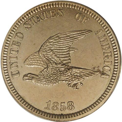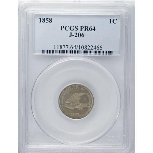<B>1858 P1C Flying Eagle Cent, Judd-206, Pollock-242, R.5, PR64 PCGS.</B></I> Snow-PT16, Die Pair 2 with the Type Two over Type Three reverse. Paquet's Small Eagle obverse paired with the regular issue Low Leaves reverse. Struck in copper-nickel with a plain edge. A nicely mirrored walnut-brown specimen, identified by a few russet specks near the end of the tail feathers. Population: 18 in 64, 2 finer (10/06).<BR><BR><b>Shipping:</b> Coin/Currency (<a target="_blank" href="http://www.heritageauctions.com/common/shipping.php">view shipping information</a>)