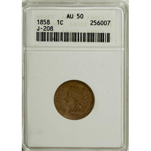 <B>1858 P1C Indian Cent, Judd-208, Pollock-259, Snow-PT28, R.1, AU50 ANACS.</B></I> The well-known transitional pattern for the issued 1859 Indian cent. The centered date variant with five leaf clusters on the wreath. Struck in copper-nickel with a plain edge. A briefly circulated tan-toned piece with clean fields aside from a thin mark beneath CENT.<BR><BR><b>Shipping:</b> Coins & Currency (<a target="_blank" href="http://www.heritageauctions.com/common/shipping.php">view shipping information</a>)