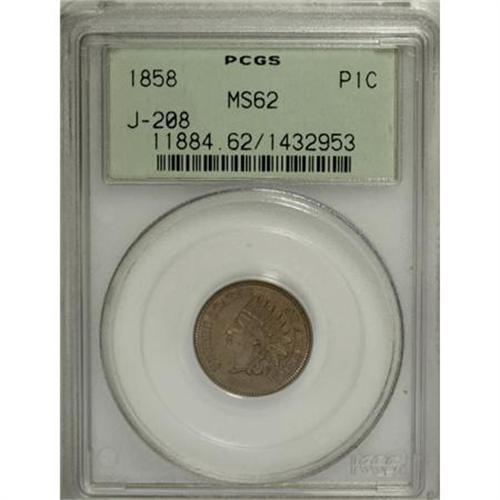 <B>1858 P1C Indian Cent, Judd-208, Pollock-253-254, 259, 261, R.4-7, MS62 PCGS.</B></I> The obverse has the date centered rather than low with the rounded bust of 1860 and later issues. The reverse has a laurel wreath with five-leaf clusters. Struck in copper-nickel with a plain edge. The obverse shows the usual gray-tan color of copper-nickel cents, but the reverse is several shades deeper. <BR><BR><b>Shipping:</b> Coins & Currency (<a target="_blank" href="http://www.heritageauctions.com/common/shipping.php">view shipping information</a>)